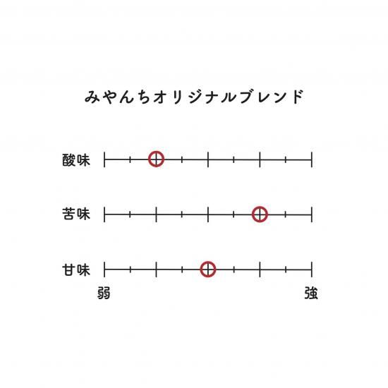 お湯を注げば、広がる香りとともにどこからかハミングが聞こえてくるような、日々の時間を明るく彩る晴れやかな一杯です。13年間みやんちで愛されてきた味をご自宅で。お食事にもスイーツにも合う、深煎りブレンドです。