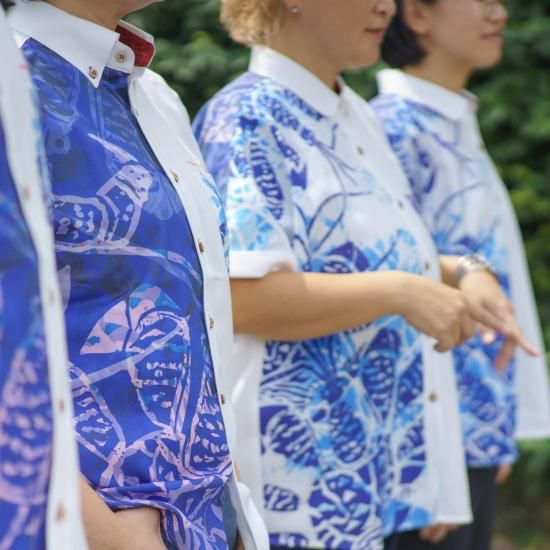 穏やかな夕凪の日の水面のような幻想的なデザインと、爽やかに晴れた日の海のような爽快感のあるデザインの、2種類のコントラストが楽しい1着になりました。